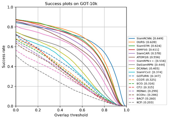 GOT-10k is a large-scale benchmark including several common challenges in object tracking, including occlusion, scale variation, aspect ratio variation, fast motion, illumination variation, and small/large objects. The dataset contains more than 10,000 video segments of real-world moving objects and over 1.5 million manually labeled bounding boxes. The dataset is backboned by WordNet, and it covers a majority of 560+ classes of real-world moving objects and 80+ classes of motion patterns. Success rate is the ratio of the frames whose overlap between ground truth and prediction bounding box is over 50% to total frames. As shown in Figure 6, our CTT surpasses DiMP50 and SiamRPN++ by 2.8 and 12.3 points in SR (success rate), respectively. Although our method lagged behind SiamRCNN [46] by 1% in accuracy, we achieved a speed of 28FPS, which is much faster than 2FPS by 14 times.