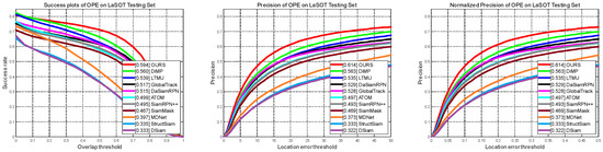 LaSOT is a high-quality benchmark for large-scale single object tracking. LaSOT consists of 1400 sequences with more than 3.5 million frames in total, making LaSOT the second largest densely annotated tracking benchmark. The average video length of LaSOT is more than 2500 frames, and each sequence comprises various challenges deriving from the wild where target objects may disappear and reappear again in the view. LaSOT is divided into training and test subsets according to 4:1. That is, for each category, we select 16 videos for training and 4 videos for testing, and finally, we can obtain 1120 training videos and 280 test videos. We calculate normalized precision and success (rate) by one-pass evaluation, which are the same as OTB-100. As shown in Figure 7, comparing with ten comparable trackers, our tracker achieves top performance in terms of success, precision, and normalized precision at about 50FPS.