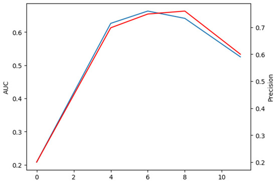 Analysis of the impact of numbers of encoders and decoders in transformer architecture of Figure 2. AUC and precision as shown by red and blue line, respectively.