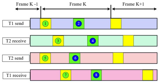 Without a loss of generality, we assume that each measurement terminal is equipped with a DWAPC-TSM unit. Here, we take two terminals as specific research targets, and name them T1 and T2. The two terminals send DWAPC-TSM-related frame information to each other independently and mutually. The baseband frequency and carrier transmission frequency used locally are generated by a local frequency synthesizer (LFS), and there is no attached constraint relationship between the two sides. The two terminals T1 and T2 independently use their respective local reference clock, local pseudorange information, received local reference clock, and local pseudorange information transmitted by the other party to adjust the calculated distance, time synchronization error, sampling interval (time), and other measurement information between terminals T1 and T2. The specific description of the DWAPC-TSM system is shown in Figure 1 and Figure 2.