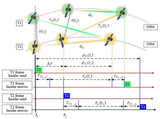 The above equation shows that, due to the clock bias , the baseline calculation error and the time difference (that is, the clock bias) calculation error caused by the relative motion between terminal T2 and terminal T1 are proportional to and : when the two terminals are relatively stationary, that is, when = 0, the clock bias will not cause measurement error; when the clock bias between terminals is 0, that is, when = 0, the relative motion between terminals will not cause measurement errors. Assuming a measurement refresh rate of 0.1 s, the maximum value of the resolvable clock bias, , for the ranging-time comparison is 0.1 s. Taking satellite and aircraft as an example, the relative velocity between terminals is < 10,000 m/s, therefore, for the mean value of in , < 10,000 m/s. Taking terminal T2 as an example (terminal T1 is similar), when the clock bias is not adjusted before the time comparison, the baseline calculation error and clock bias calculation error are: