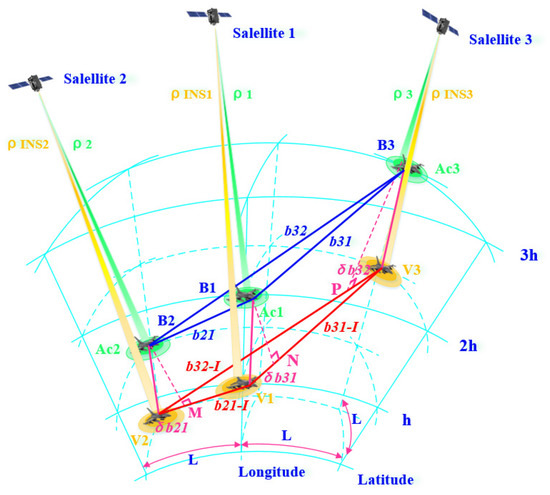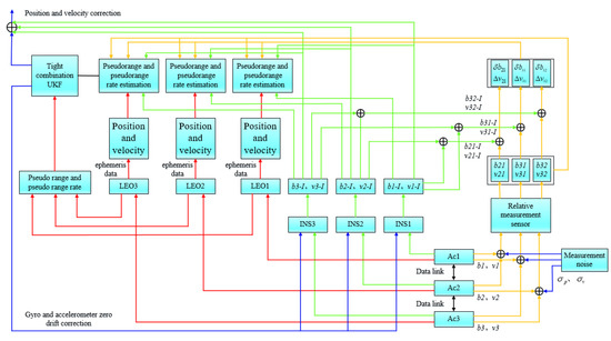 To meet the development needs of 6G, AI, and smart cities in the future, there is an urgent need for an absolute positioning and cooperative positioning system, as well as corresponding algorithms that can adapt to the future with high precision and low latency. In recent years, the low-earth orbit (LEO) constellation, with its unique advantages of low propagation delay, less link loss, and relatively strong signal power [12,13], is expected to be used in unmanned cooperative operations and autonomous driving in the future. In addition, airborne data link systems, such as the joint tactical information distribution system (JTIDS), have the integrated functions of communication, navigation, and identification, can be used by sea, land, and air motion carriers, and have interoperability in sea, air, and land coordinated operations. The JTIDS is a large-capacity, anti-jamming digital information distribution system [14]. The global navigation satellite system (GNSS) information and inertial navigation system (INS) information of two or more nodes are shared on one node by using the communication function of the airborne data link, and the measurement information between nodes is obtained by using the precise ranging and velocity measurement functions of ranging and velocity sensors. Then, the relative GNSS information, relative INS information, and measurement information are combined to realize the joint correction of multiplatform INS errors, and the optimal cooperative navigation information is obtained. On the one hand, the scheme has the advantages of a large amount of shared information and high frequency, especially the proprietary link of the system, which can ensure the large amount of information and high update rate shared between nodes [15]; on the other hand, due to the introduction of high-precision measurement information, the problem where cooperative navigation accuracy is overly dependent on GPS is well resolved.