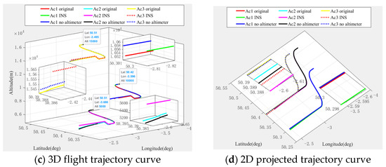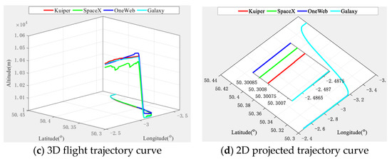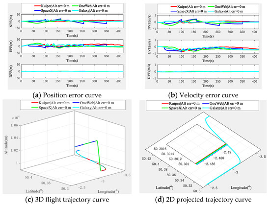Figure 13 and Figure 14 show that regardless of altimeter assistance, due to the different parameters of each constellation, such as the inclination angle and orbit height and the distribution of satellite orbits which lead to the GDOP value and various interferences of the system, the error curve of the multi-aircraft cooperative navigation and positioning algorithm based on the DWAPC-TSM system varies slightly in individual directions. However, in general, the navigation and positioning performances for each LEO constellation are roughly the same, and with the aid of an altimeter, the performance of the algorithm is significantly improved. From the final three-dimensional trajectory curve and its corresponding projection curve, there is almost no difference between the trajectories of the LEO systems, which means that with the aid of an altimeter, the difference between the algorithms for different LEO systems is also reduced, and good cooperative navigation and positioning performance can be obtained using different LEO constellations. These results show that the proposed algorithm is generally applicable to the future LEO constellation scheme of integrated communication and navigation (ICN).
