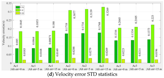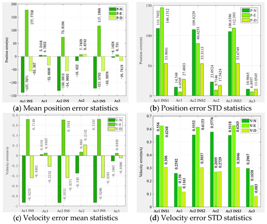 As Figure 7 shows, the position error of pure INS cooperative navigation is significantly higher than that of the DWAPC-TSM system multi-aircraft cooperative navigation and positioning algorithm, regardless of the mean and standard deviation, and its maximum positioning accuracies are approximately 146.1312 m (Ac1 INS), 109.8229 m (Ac2 INS), and 112.3930 m (Ac3 INS); the corresponding maximum velocity accuracy is 0.62 m/s (Ac1 INS), 0.61 m/s (Ac2 INS), and 0.62 m/s (Ac3 INS). However, for the altimeter-assisted DWAPC-TSM system multi-aircraft cooperative navigation and positioning algorithm, the corresponding maximum positioning accuracies are 27.4803 m (Ac1), 23.2524 m (Ac2), and 11.0545 m (Ac3), and the corresponding maximum velocity accuracies are 0.2592 m/s, 0.5774 m/s, and 0.2967 m/s. In comparison, the performance of the multi-aircraft cooperative navigation and positioning algorithm based on the WP-CTM system without altimeter assistance is greatly improved, as compared with that of the pure INS cooperative positioning algorithm, which can meet the basic location service requirements in challenging environments.