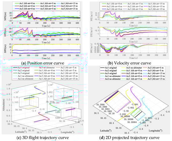 In view of the fact that different ranging and velocity sensors may have different measurement accuracy in practice, which will affect the relative positioning accuracy and may affect the final navigation and positioning accuracy, in this section, we focus on the simulation analysis of the influence of different relative positioning accuracy on the final navigation positioning error. Similarly, due to space limitations, we only analyze the unbiased altimeter-assisted situation. Without loss of generality, we only take aircraft 1 as the analysis object.