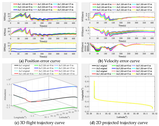From Figure 10, we can see that when the formation is flying horizontally and collinearly, the position and velocity error of each aircraft do not diverge, but converge, and with the increase of the altimeter error, there is also a corresponding increase in the navigation and positioning error. The final three-dimensional error and trajectory curve and its projection error trajectory curve also have similar conclusions. It can be seen that the formation horizontal collinear configuration has no effect on the performance of the algorithm.