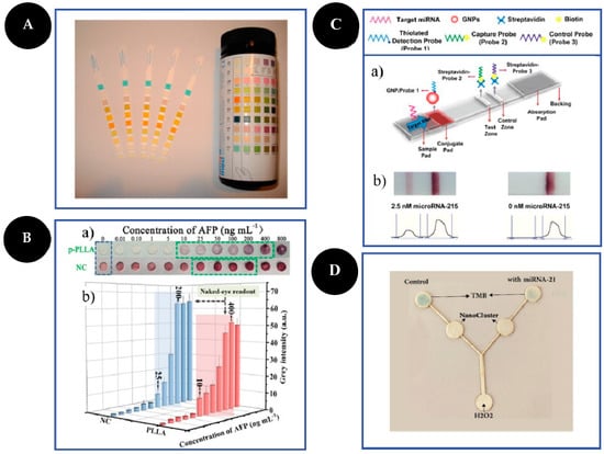 Examples of different types of PADs. Dipsticks (A): urine test strips. Reproduced and adapted with permission from [13]; Spot test (B): photographs (a) and bar charts (b) of the corresponding grey values of the colorimetric readout based on a highly porous poly(L-lactic) acid nanofiber and NC platforms for AFP detection. Reproduced and adapted with permission from [30]; LFA (C): schematic representation of LFA principle for the detection of microRNA-215 (a) and photographs and corresponding optical measurements (b) of the developed LFA in the presence (2.5 nM) and absence (0 nM) of microRNA-215. Reproduced and adapted with permission from [32]; µPAD (D): photograph of the microfluidic sensor for detection of 1000 pM of microRNA-21 based on peroxidase mimetic activity of DNA-templated Ag/Pt nanoclusters. Reproduced and adapted with permission from [26].