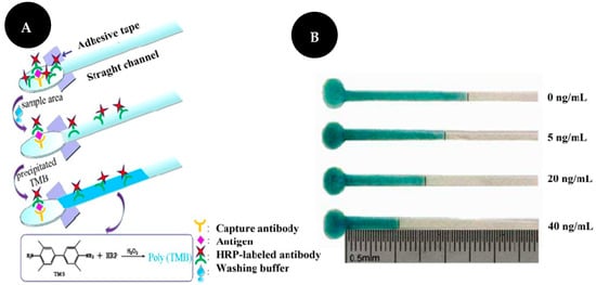 Chen and co-workers [15] developed a distance-based immunosensor on a μPAD for the semi-quantitative detection of CEA (Figure 4). Firstly, a capture Ab was immobilized on the sample area after oxygen plasma treatment. Then, the target and an HRP-modified Ab were added. The TMB-hydrogen peroxide system was used as chromogenic and its interaction with HRP-labelled Ab led to the development of a visible blue bar that is inversely correlated to analyte concentrations, from 0 to 40 ng/mL. This work enables CEA detection based on the length of the colored band, which can be observed with the naked eye without the use of external equipment such as a camera or scanner. CEA detection was carried out in serum and levels as low as 5 ng/mL could be detected by this device. The LOD was set at 2 ng/mL.