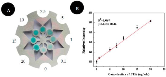 Liu and colleagues [38] developed a colorimetric immune system for CEA detection in human serum, with eight microfluidic channels created by the paper cutting fabrication method (Figure 5). This device integrates a ring-oven technique, in which the nonspecific binding protein can be easily washed away from the detection area to the waste by capillary forces. This washing process includes an oven in which the filter paper is adapted. The washing buffer is dropped on the middle of the paper and the nonspecific binding protein were carried to the border of the paper circle and then its solvent is evaporated from the filter paper due to the existence of the heated ring-oven. The paper was modified by the chitosan coating and GA cross-linking method to enable the covalent immobilization of Abs. Hrp-labeled Abs were used to catalyze TMB in the presence of hydrogen peroxide. A blue color is formed and observed by the naked eye. To obtain quantitative data, the results were captured by a scanner and analyzed with ImageJ. The greyscale was used, and its value is inversely proportional to CEA concentration. This device achieves a LOD of 0.03 ng/mL and a good linearity was obtained from 0.1 to 20.0 ng/mL of CEA.