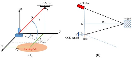Figure 2a depicts the observation geometry. The LiDAR is in the origin of the reference frame, the UAV position is given by (), α is the servo motor angle, β and the slant range D are estimated by the laser sensor, rotating around an axis parallel to the xy-plane, and the co-ordinates of the center L of the landing area are (). For the sake of simplicity, the landing field and the LiDAR sensor are supposed coplanar, but the generalization for (i.e., a difference in height between the landing field and the sensor) is straightforward.