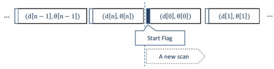 RPLIDAR A1′s scan rate is 5.5 Hz (configurable up to 10 Hz) when sampling 360 points per scan, with a typical sample frequency of 4 kHz (1 sample every 250 µs). With 5 V supplied by the power module during our tests, the sensor rotates at 468 rpm (i.e., the scan frequency is 7.8 Hz, or 128 ms per revolution), collecting (on average) 515 samples per revolution (i.e., the sample frequency is approximately 4 kHz). The assembly contains a range scanner system and a motor with speed detection and adaptive system. It can operate excellently in both indoor and outdoor environments with no sunlight. The system automatically adjusts the laser scan rate according to the motor speed and uses UART serial port (115,200 bps rate) as the communication interface with host computers or controllers. After power-on, the sensor starts rotating and scanning clockwise. The distance data acquired can be stored on a PC or a microcontroller (e.g., Raspberry, Arduino) through the communication interface (USB connection). Table 2 reports information of each sample point, whereas Figure 4 visualizes the formatted dataflow.