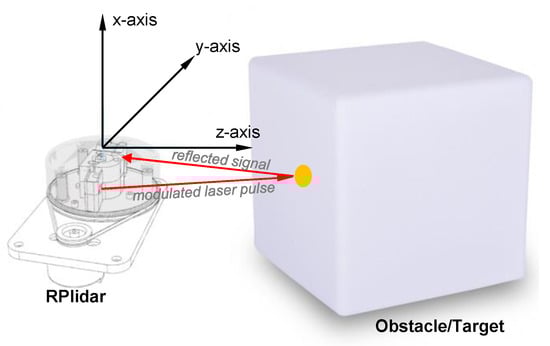 The low-cost, 360-degree FOV (Field Of View) laser range scanner RPLIDAR Model A1M8, built by Shanghai Slamtec Co., Shanghai, China, [36], shown in Figure 3, has been widely used in a variety of applications in robotics, in particular in the framework of SLAM (Simultaneous Localization and Mapping) methodologies for mobile robots [37]. It measures the distance from an object emitting a laser beam which is reflected by the object surface and measured and received by a position-sensitive detector. Built-in circuitry calculates the distance from the object by means of triangulation, based on the position of the detector with respect to the reflected light, obtaining range and angular data in the sensor coordinate system.