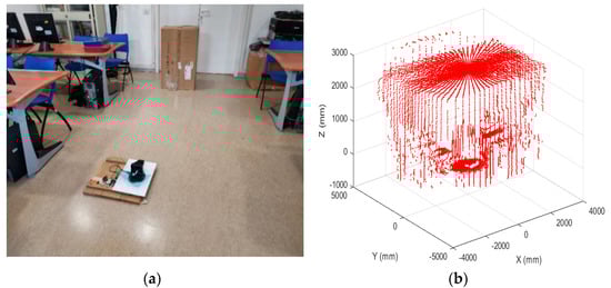 (a) Indoor experiment scenario (room dimensions: 6400 × 2890 mm); (b) 3D reconstruction from LiDAR data.