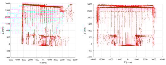 By using laboratory open spaces, a simulated airfield has been built up (Figure 11) to test the LiDAR scanning capability in an area surrounding an assigned landing field. Every data acquisition campaign had a duration of 1 min, and data were sampled at 4 kHz. The control volume was mapped by the system, and some obstacles with known dimensions were placed to verify the obstacle detection capability of the ground station. Reference distance measurement were collected with a laser distance meter (Bosch PLR 40C [42]). Post-processed data allowed us to reconstruct the 3D flight volume and evaluate possible nonlinear distortion effects, imprecise pointing accuracies, and distance measurement errors.