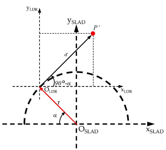 The rotation angles (Φ, Θ, Ψ) to be estimated are derived from a linear regression analysis in the three orthogonal planes. The angular coefficients of the regression lines are evaluated with respect to the three axes ). As far as the translation is concerned, indicating with r the distance between the origin of the SLAD reference and the LiDAR reference (equal to 85 mm), we have (Figure 13):