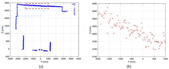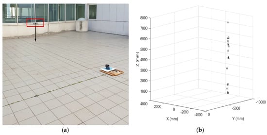 After extrinsic calibration, a UAV entered the scenario (highlighted in the red box in Figure 22a), and data were acquired from the ground system when the aircraft reached a distance from the ground of 7000 mm. Post-processed data are shown in Figure 22b.