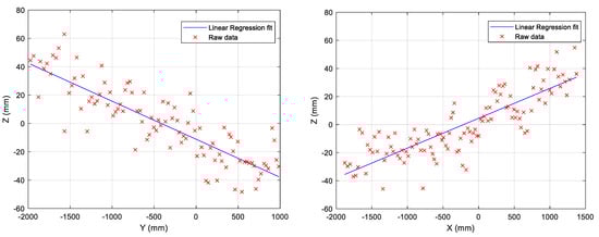 where are the coordinates of a point in the “image” and n+1 is the number of measurements. Figure 15 shows the regression lines for xy- and yz-planes, Table 3 gives the numerical values of m and p, and Table 4 shows the corresponding angles of the regression lines.