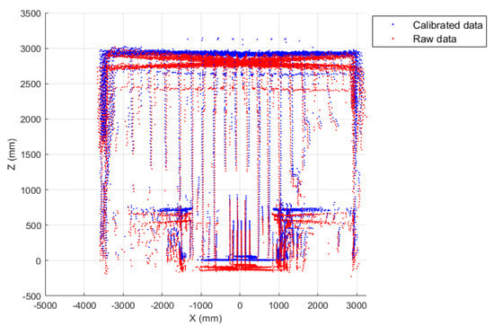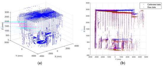 (a) 3D reconstruction scenario from calibrated data; (b) Comparison between raw and calibrated data (yz-plane).