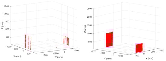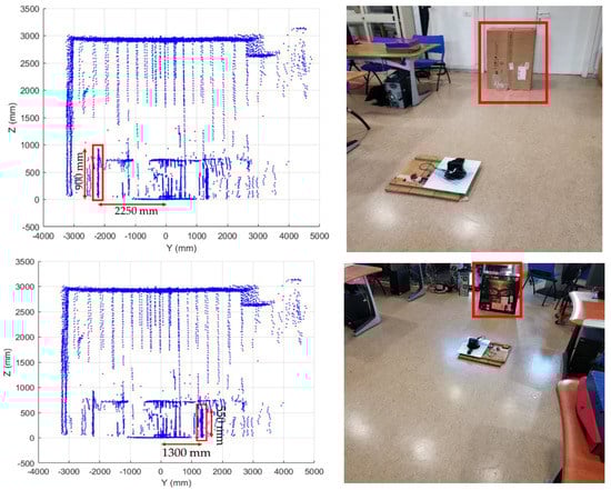 We placed two obstacles in the landing scenario, with dimensions 900 × 600 mm at a distance of 2250 mm from the SLAD system, and 550 × 550 mm at a distance of 1300 mm. Figure 19 (red boxes) shows the obstacle positions in the corrected point clouds, and Figure 20 shows the result of the “difference image” between the clean landing field and the same field with the obstacles.