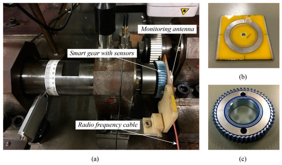 The smart gear health monitoring system: (a) practical smart gear health monitoring system; (b) monitoring antenna; (c) smart gear sensor.