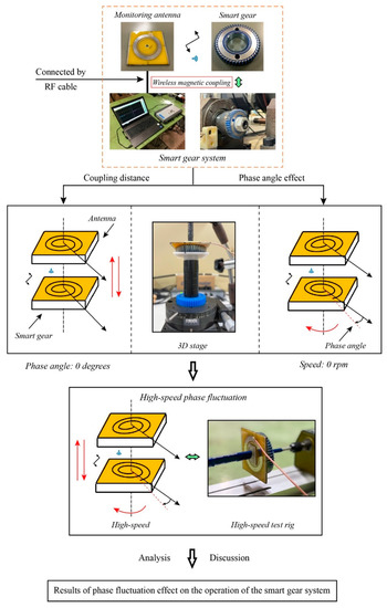 However, in a practical gear operation, the smart gear will rotate for the power transmission while the antenna is fixed, and the phase angle of the smart gear with respect to the monitoring antenna will change continuously. In accordance with this condition, the consideration of the influence of this phase angle change on the magnetic coupling is essential. Based on this consideration and its result, the authors can make a comparison and evaluate the potential error that can lead to any wrong diagnosis of the gear failure detection process. In a previous study [12], although the effect of phase fluctuation has been mentioned and considered by the authors, the result of this study can only show the effect when the phase angles were regularly changed at static conditions. Moreover, the samples are only two POM plates with sintered patterns on their surfaces. Thus, in this research, the authors focus on considering the effect of phase angles on the magnetic coupling signal comprehensively. Instead of POM plate samples, a practical smart gear system is utilized for the analysis and evaluation. This practical system includes a monitoring antenna with a connector and a completed smart gear with a healthy sensor chain. Experimental works are performed to evaluate the effect of phase fluctuation for both static and high-speed rotational conditions. Furthermore, the effect of the coupling distance that is familiar in a magnetic coupling system is also implemented and expressed as a supplement for the evaluation of the phase fluctuation effect in this research.