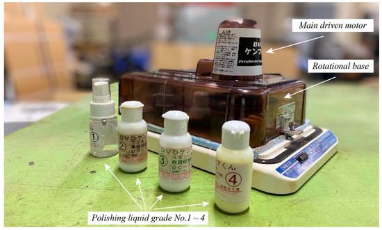 In order to resolve the discussed limitation, an idea to improve the surface quality of the MC 901 gear has been proposed. Figure 5 illustrates a specialized device for the MC 901 gear surface treatment work. Originally, this device is a DVD polisher with one main DC electric motor on its top and a rotatable circular plate at the bottom. During the operation, a fabric circular plate is attached to the spindle of the DC electric motor while the targeted polishing object is placed on the lower rotatable plate. Since the center axis of the upper DC electric motor and the center axis of the lower rotatable plate are deflected to each other, the relative movement of the upper DC electric motor and the lower rotatable plate carrying a DVD can polish the surface of the DVD well. Aiming to use this operation feature for the MC 901 nylon gear surface treatment, this DVD polisher device has been reconfigured. Particularly, the distance between the center axes of both the upper DC electric motor and the lower rotatable plate is increased. Moreover, the height of the upper fabric circular plate, with respect to the lower rotatable plate, is also increased. Then, the configured device in Figure 5 can be used to polish the surface of the MC 901 spur gear. To do that, the MC 901 gear is placed on top of the lower rotatable circular plate. The circular fabric polishing pad, which is driven by the upper DC electric motor, is adjusted to contact directly on the desired treating surface. The distance between the pad and the gear side is adjustable by a screw to control the operation speed of the rotational base. To enhance the polishing quality, the four polishing liquids denoted in Figure 5 were also applied directly on the gear-treating surface.