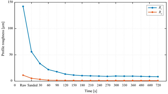 Figure 6 specifies the roughness chart of the accomplished polishing process. In this figure, the blue line denotes the roughness value Rz while the orange line denotes the arithmetical mean roughness Ra value. At a first glance, the sharp change of the roughness value Rz right after the initial treatment has occurred between the “Raw” and “Sanded” indexes can be observed. The fine treatment step belongs to the range between “Sanded” and 210 s. Although a reduction in the roughness value is noticeable, the change becomes small in value compared to the change of the surface condition in the initial treatment step. Moreover, it is certain that the roughness value Rz is almost stable when the treatment process surpasses 210 s and reaches 720 s or about 8.5 min in total at around 10 µm. On the contrary, the arithmetical mean roughness Ra does not show any critical change in its value during the treatment procedure.