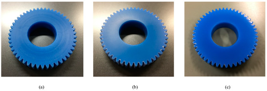 The comparison of the surface quality of an MC 901 gear before and after the treatment procedure process: (a) raw surface (original gear surface); (b) sanded surface; (c) finished surface.