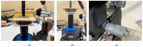 The experimental setting in Figure 8 is for the consideration of the coupling distance effect and the static phase fluctuation effect. Since both the coupling distance effect and the static phase fluctuation effect are conducted by only one experimental rig, the experimental setting must be configured compatibly to use for two cases without any additional configuration during the test. To do that, a magnetic base with an arm and a three-dimensional (3D) stage is employed to combine with each other. While the purpose of the magnetic base is used to hold the monitoring antenna firmly and in parallel with the smart gear, the 3D stage will carry and perform two movements of the smart gear. For the first case, the experiment of the coupling distance effect requires the movement of the smart gear along its central axis or the Z direction. Then, for the second case, the experiment of phase fluctuation requires the rotation of the smart gear around this Z direction at a fixed distance; here, it is 1 mm. Prior to the start of the experiments, the monitoring antenna—held by the arm of the magnetic base and the smart gear—is carried by the three-dimensional stage and must be aligned concentrically and in parallel with each other. This can be considered to be the most important and time-consuming initial step, since it can directly affect the experimental results if any faults occur during the configuration. According to [11], to retain the magnetic coupling of the system, the monitoring antenna must be kept connected to the network analyzer from the beginning until the end of the experiment via its integrated RF connector. In addition, to prevent or mitigate any unexpected noise that might occurr due to the loose connecting point during the experiment, the connecting point of the monitoring antenna and the network analyzer should be secured. Here, the connector point is consolidated by a non-metallic tape, as illustrated in Figure 8a. Figure 8b,c shows the 3D stage, which has a top plate that can be moved to the X, Y, and Z direction and rotated around its center axis. As a result, the two movements of the smart gears in the experiments including the rotation for the phase fluctuation and the translation along the center axis for the coupling distance analyses can be conducted via this 3D stage.