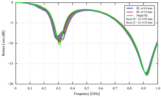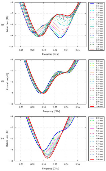 According to Figure 11, it is clear that the changing amplitude of the resonant return loss values is much different for three minor ranges of distance. These are the ranges of 0 mm to 1 mm, 1 mm to 2 mm, and 2 mm to 6 mm. In these three ranges, the maximum changing amplitude of the resonant return loss values can be seen in the first range of 0 mm to 1 mm, especially from 0 mm to 0.5 mm. Specifically, the depth of the second resonant peak located on the right side of the 0.3 GHz valley in Figure 11a shows a remarkable changing amplitude of −1.82 dB. However, within the range of 0 mm to 0.5 mm, the changing amplitude also reaches −1.222 dB, which takes about 67.14 [%] of the total changing amplitude value in the 0 mm to 1 mm range. In Figure 11b, within the range of 1 mm to 2 mm, the changing amplitude is insignificant for the second resonant peak on the right side, while this value remains constant for the first resonant peak. The resonant peaks at 1 mm and 2 mm are denoted by the blue line and red line, respectively. The noticeable point in this figure is the variation of the valleys’ shapes from the two-peak shape at 1 mm to the approximate one-peak shape at 2 mm of the coupling distance. Figure 11c clearly shows the change of the valleys’ shapes into a one-peak shape at 6 mm. This one-peak shape is denoted by the red line. The changing amplitude of the peaks at 2 mm and 6 mm is equal to 0.694 dB.