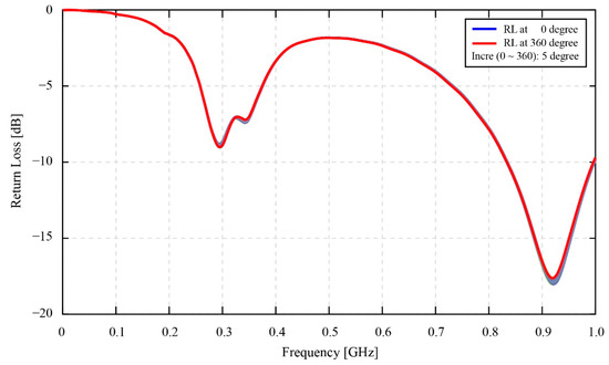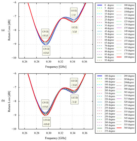As can be seen, Figure 13 indicates that the forms of the resonant return loss data have been clearly changed in accordance with the switching of the phase angle values. However, these changes do not occur proportionally to the increase in the phase angle values from 0 degrees to 360 degrees. Specifically, in the range of 0 degrees to 180 degrees of the phase angle values, the return loss values of the first resonant peak have steadily changed from their minimum value of −9.03 dB to a maximum value of −8.80 dB. Moreover, the frequency value of this peak also decreases from a maximum value of 0.296 GHz to a minimum value of 0.294 GHz. In the range of 0 degrees to 360 degrees, the return loss values and the frequency values of the second resonant peak also change from their maximum value of −7.21 dB to a minimum value of −7.42 dB and their maximum value of 0.343 GHz to a minimum value of 0.342 GHz. Overall, in the first half of the 360 degrees of the phase angle values, the frequency values of two resonant peaks gradually decrease, while the values of the return loss of these peaks increase and decrease, respectively. Likewise, in the second half of the 360 degrees of the phase angle values, the changes also appear for both the return loss and frequency values. The ranges of return loss and frequency for the first resonant peaks are −9.04 dB; 0.295 GHz to −8.82 dB; 0.294 GHz and the second resonant peaks are −7.20 dB; 0.343 GHz and −7.41 dB; 0.342 GHz. Surprisingly, in contrast to the tendency of the change in the return loss and the frequency value of the first half of 360 degrees of the phase angles, the return loss value decreases for the first peak and increases for the second peak, while the frequency values of these two peaks gradually increase.