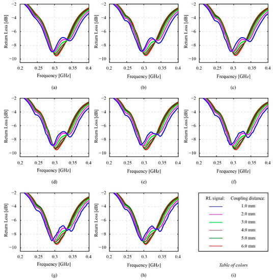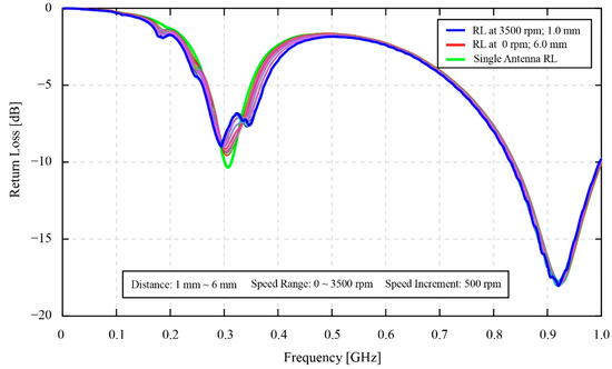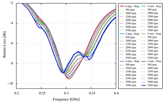 Figure 16 contains eight minor figures of the extracted return loss data at a specific speed and in a range of a coupling distance. The arrangement of the component figures in Figure 16 is based on the increase in the rotational speed. Specifically, from Figure 16a–h, the collection of the resonant return loss values that have a similar rotational speed and range from 0 rpm to 3500 rpm with an increment of 500 rpm are presented, respectively. Moreover, at each of these specific rotational speeds and one minor figure, six resonant return loss values that belong to six values of coupling distances are provided for the comparison, respectively. These six values are denoted by six different colors. The blue color line presents the return loss value measured at the coupling distance of 1 mm. Similarly, the other resonant return loss values measured at the coupling distance of 2, 3, 4, 5, and 6 mm are correspondingly presented by magenta, green, brown, dark green, and red color lines.