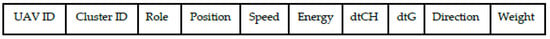 - Role distinguishes a UAV as a CH or a CM in a cluster. It is a binary field, where 1 refers to CH and 0 is for CM.