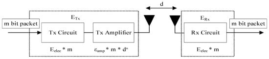 The radio energy dissipation model is shown in Figure 3. When the transmission distance is less than the threshold , the free space channel model is used and the power amplifier coefficient is set to . When the transmission distance is greater than or equal to the threshold , the multi-diameter decay model is used and the is set to .