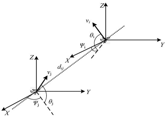 In FANETs, the relative mobility of nodes in a cluster should be controlled within a certain range to guarantee the stability and robustness of the network. The nodes with fast moving speed are not eligible to be candidates for CH selection. As mentioned above, the UAVs are equipped with IMU and GPS. In this work, a method is proposed to calculate the relative mobility of UAVs in a 3D coordinate system, by using the location and speed information. The movement state of node and is shown in Figure 4, and the speed differences between and in , and axes are given as the following: