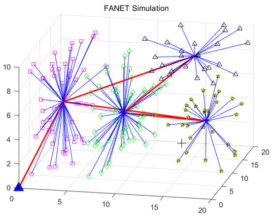 The lowest ID clustering algorithm (LID) was proposed by Gerla et al. [7], where UAV nodes with lower IDs were selected as CHs. This algorithm is widely used, owing to its low time complexity and overhead of maintaining the clustering structure. However, the UAV nodes with lower IDs run out of battery faster than other nodes, because they act as the CHs and consume more energy, which finally leads to faster network partitions. LEACH-C (Low Energy Adaptive Clustering Hierarchy-Centralized) [8] is a classic centralized CH generation algorithm, where the base station is responsible for selecting CHs in the algorithm. The hybrid energy-efficient distributed clustering algorithm (HEED) [9] states that extending network lifetime and load balance are the main requirements in FANETs. The network lifetime is extended by evenly distributing energy consumption across the network. The CH generation is carried out within finite iterations in HEED, which minimizes the control message overhead. To enhance the QoS performance in FANETs, an SDN-MQTT (Software Defined Networking-Message Queue Telemetry Transport) [10] scheme is proposed. The paper presents a hybrid structure of SDN and MQTT for battlefield UAV clusters, which is scalable and controllable for network topology and payloads. The SDN-MQTT structure can support flexible packet transmission and improve communication security.