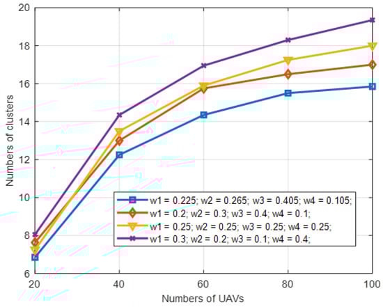 As can be observed from Figure 7 and Figure 8, the first group of weight settings outperforms the others on the number of clusters and network lifetime, where the number of clusters refers to the actual number of clusters , and the network lifetime refers to the occurrence time of the first UAV node running out of energy in the network. The reason for this is that the effect of the four physical factors on the performance is ranked as Mi > Ni > Ei > Di. We set the four weights with the values provided by the first group in the rest of the simulation experiments, which not only matches the ranking, but also optimizes the tradeoff among these physical factors.