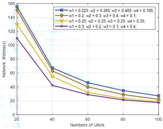 The performance of IWLC is evaluated under the condition of different weight settings and different numbers of UAVs. The maximum speed of UAVs is 30 m/s, and the transmission range is 300 m. Here, we select four different sets of weight values for comparison in Table 4. The first group of weight settings is determined based on the maximum entropy method [32,33]. For the third group, the four weights are set equally. For the second and fourth groups, the four weights are set with biased values.