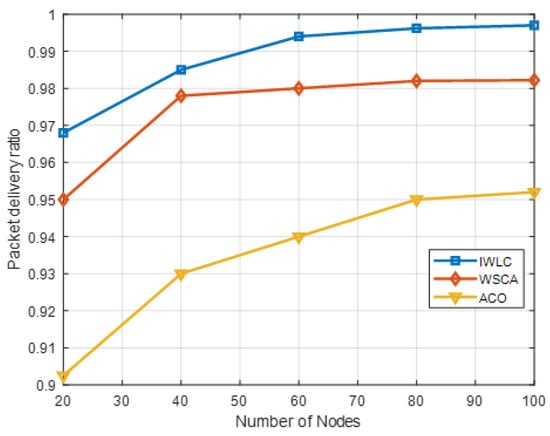 where represents the number of packets successfully received by the destination nodes, and represents the total number of packets generated by the source nodes. The destination nodes are the CHs and GCS. The UAV nodes in each cluster send data packets to the corresponding CH, and CHs forward the data packets to the GCS. The higher the PDR, the better the communication quality. The UAV nodes’ distribution is uneven, and the relative mobility is not regular when the number of nodes is small; thus, the PDR is lower. The PDR of three schemes grows with the increasing number of UAV nodes. The IWLC outperforms the other two schemes with a maximum PDR of around 99.7%, when the number of UAVs increases to 100. The higher number of UAV nodes maximize the probability that transmits packets to the destinations. The reason for this is that the IWLC scheme selects stable CHs to forward packets and adopts an efficient clustering algorithm to connect UAV nodes and GCS. Moreover, the IWLC scheme adopts effective cluster maintenance to avoid network congestion and reduce the probability of link disconnection, which improves the connectivity of UAVs and transmission success ratio.