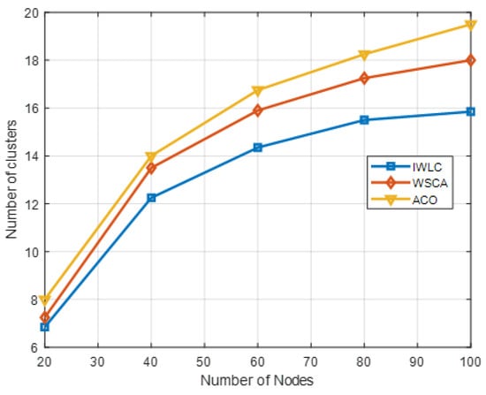 Figure 10 shows a comparison of the number of clusters as the number of UAVs varies. The number of clusters for three schemes is constantly growing with the increasing number of UAV nodes in the network. It is clear that the proposed IWLC forms fewer numbers of clusters than the other two schemes. It is because uniform clustering prevents the existence of clusters with isolated nodes or few numbers of nodes, which optimizes the clustering structure. The number of clusters is fewer than the initial optimal value It could bring an excessive load on the CHs with the increasing number of CMs. However, it can be observed from the IWLC scheme that the growth trend of the number of clusters is more stable, which can better cope with the increasing number of nodes and improve the scalability of the clustering network. In addition, in the cluster maintenance phase, the scheme takes into account the changes and movement of nodes to keep the stability of each cluster in the network.