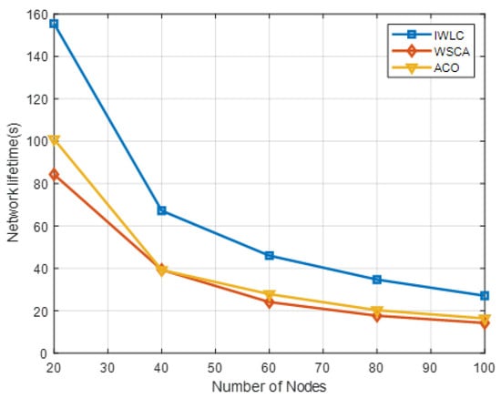 Figure 11 shows the performance comparison of IWLC with WSCA and ACO in network lifetime, by varying the number of UAVs. The network lifetime of the clustering schemes decreases, owing to the larger number of UAVs changing the mobility and stability of the network topology with increasing network density. The IWLC has the longest network lifetime compared with the other two schemes, due to its comprehensive CH selection algorithm and cluster maintenance. The proposed scheme fully considers the remaining energy and relative mobility of UAVs, and the weight parameter settings of them are relatively large, which could adapt to the frequently changing energy consumption and network topology. The proposed scheme significantly improves the robustness and adaptability of the network.