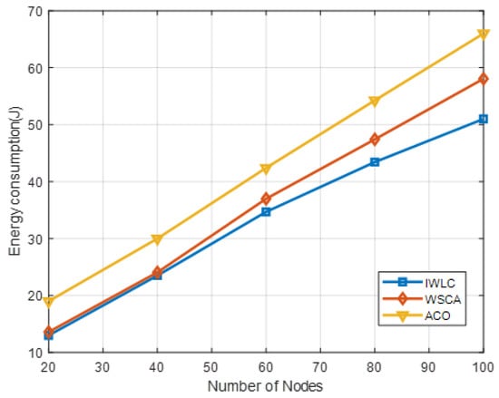 Figure 12 depicts the energy consumption under different numbers of UAV nodes. It indicates that the energy consumption of the proposed IWLC scheme is the lowest, as compared to the other two algorithms. The energy consumption of IWLC and WSCA is close when the number of UAV nodes varies from 20 to 40. However, as the number of nodes increases, the energy consumption of IWLC is less than that of WSCA, because of its efficient CH selection and cluster maintenance algorithms. The effective packet transmission reduces the extra energy consumption on communications.