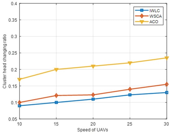 The performance of IWLC is evaluated and compared with the clustering scheme of WSCA and ACO, by varying the speed of the UAVs. The number of UAVs is 100. As can be observed from Figure 13, the cluster head changing ratio grows, owing to the rapidly changing topology and link instability with the increasing speed of the UAVs, and the cluster head changing ratio of the IWLC scheme was always at the minimum. Since the IWLC considers the weight of the four important parameters comprehensively in the CH selection phase, especially the relative mobility and adaptive node degree of the UAVs, the stability of the CHs is better than other schemes. In addition, the scheme adopts a stable clustering formation and cluster maintenance strategy to reduce the replacement frequency of CHs; thus, the selected CHs can better adapt to the fast-speed movement scene.