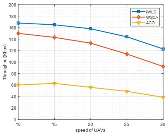 Throughput is an importance metric to assess the performance of the clustering network. In this work, throughput is evaluated by the total amount of data transferred from the source UAV nodes to destinations within a time period. The throughput under different speeds of UAVs is provided in Figure 14. As shown in Figure 14, the throughput of IWLC and WSCA decreases with the speed of UAVs increasing from 10 m/s to 30 m/s, and the throughput of ACO is relatively lower and starts to reduce from 15 m/s to 30 m/s. This is because the frequency of the link disconnection and instability of clustering structure grow, with the increasing speed of the UAV nodes. The proposed IWLC scheme outperforms the other two schemes because the IWLC scheme selects more stable CHs for cluster management and maintenance. Moreover, the effective cluster maintenance strategy of IWLC scheme reduces the probability of communication link disconnection.