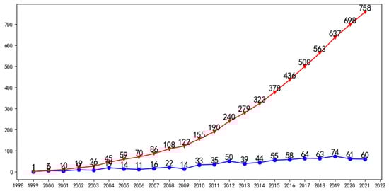 The number of publications on a topic each year is a measure of its popularity. The change in publication numbers can reflect the ability of this topic to attract scholars’ attention in different periods. Figure 1 shows annual and accumulated publications from 1999 to 2021 on the evaluation of antioxidants using electrochemical sensors. The first paper on this topic was published in 1999.