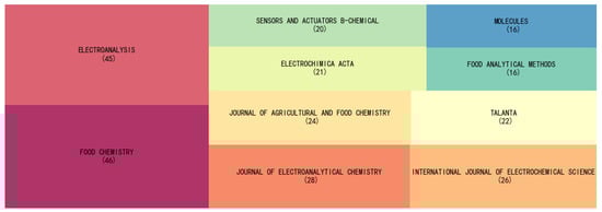Figure 2 shows the ten journals with the highest number of publications on evaluating antioxidants using electrochemical sensors. Journals related to food, agriculture, analytical chemistry, electrochemistry, sensors, and molecules are the most frequently published. Food Chemistry and Electroanalysis have published 46 and 45 papers, respectively. Although the detection of antioxidant capacity is a biochemical reaction in vivo, most of the work has not been conducted on in vivo detection. On the other hand, since taking antioxidants is thought to have health benefits, many studies have been reported on food.