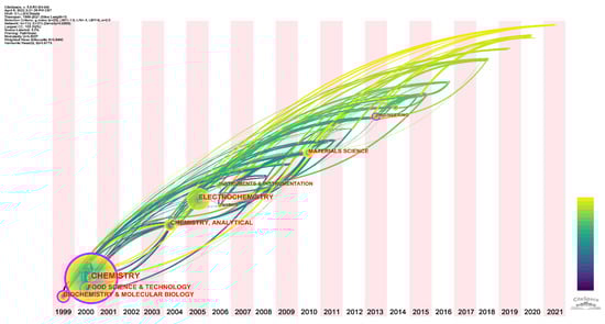 We further analyzed the categories to which all published papers belonged, which can be used to understand where the topic has cross-influence. Figure 4 shows the time-zone view of categories for evaluating antioxidants using electrochemical sensors. Although the focus of this topic is on the evaluation of antioxidation capacity by electrochemical technology, the beginning of this topic covers categories mainly in Chemistry, Food Science & Technology, and Biochemistry & Molecular Biology. In 2004, Analytical Chemistry began to be included in this topic. It was not until 2005 that the first reports were published in a journal belonging to Electrochemistry. This means that electrochemistry was initially used as a standard tool for analysis, and reports did not focus on methodological innovation. This is common in analytical chemistry, where a common technique is first tried to serve a particular purpose. However, this technology often does not fully meet this need and requires methodological innovation. That is why Instruments & Instrumentation has been included in this topic for 2016. Innovation in sensor design and methodology has become an essential part of this topic. In addition, Materials Science was added to the topic in 2010. The discovery and application of new materials can further improve the detection performance of electrochemical sensors. In 2013, Engineering was included in this topic, representing that some of these electrochemical sensors have begun to be experimented with for food industry applications. For the last five years, this topic has been extended to Thermodynamics, Agronomy, Plant Sciences, Green & Sustainable Science & Technology, Polymer Science, and Neurosciences & Neurology.
