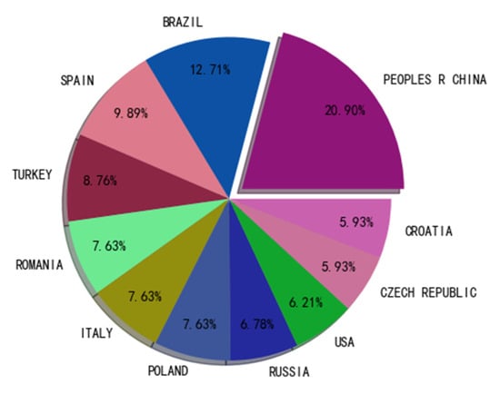 Figure 5 shows the 11 countries with the most publications. As can be seen from the chart, although China contributed 20.90% of publications, it does not mean that it is dominant. In second place was Brazil, contributing 12.71% of publications. Each of the remaining countries contributed less than 10%. As can be seen from the pie chart, this topic has attracted wide attention worldwide, mainly attracting scholars from Asia, Europe, and America. This relatively even distribution of contributions is uncommon in analytical chemistry. Our previous research found that many electrochemically related sensor analyses tend to be concentrated in South Asia, the Middle East, Europe, and South America [,].
