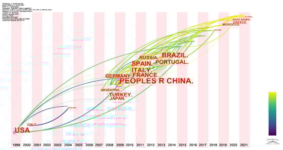 Figure 6 shows the time-zone view of the geographic distribution for evaluating antioxidants using electrochemical sensors. China, Brazil, and Spain contributed the most publications in Figure 5, but the topic was first started by scholars in the USA and Italy in 1999 and 2000, respectively. From the lines connecting different countries, it can be concluded that the work conducted by the US directly influenced subsequent work on the topic. By contrast, the work published in Italy only influenced papers published by British scientists in 2004. Since 2007, several countries have started to pay attention to the topic and become involved. Among them, Argentina became involved in the topic in 2007. Turkey, Germany, and Japan joined the topic in 2008. China became involved in the topic in 2009. Starting in 2010, the topic began to attract more countries. The countries shown in Figure 5 have participated in investigating the evaluation of antioxidants using electrochemical sensors at this stage. The topic continues to attract scientists from several countries, such as Morocco, who started research on the topic in 2019. Saudi Arabia and Greece joined in 2020. Algeria first began investigating the topic in 2021. Combined with the trend of annual publications in Figure 1 and the addition of new countries, this indicates that the evaluation of antioxidants using electrochemical sensors remains very popular and attracts scholars to explore and solve the scientific problems involved.
