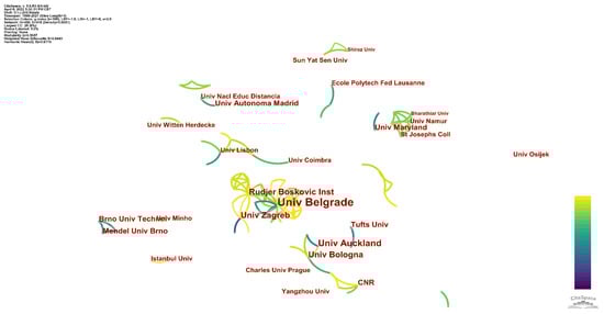Given that so many countries are involved in this topic, as shown in Figure 6, a collaboration between different institutions should be frequent. Figure 7 shows the network of cooperation between different institutions. The facts proved inconsistent between this reasonable guess and reality. Collaboration between different institutions to investigate the topic has been limited. The University of Belgrade leads only one extensive collaboration network. There are also two smaller cooperative networks. The first was led by The University of Auckland and The University of Bologna. The other is led by St. Joseph’s College New York and Universite de Namur. The remaining papers do not cover extensive collaboration, neither domestically nor internationally. In particular, the countries that contributed the most papers to the topic did not engage in large-scale cooperation to address it. This is a strange situation, but it can be found in specific research topics. In many cases, the reason is that the content of this topic does not need to be shared by large instruments, nor does it need to collect samples from different regions. As a result, a single research institution can carry out independent investigations.